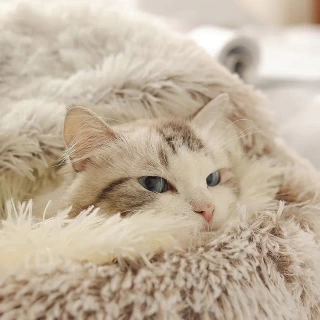 Q: Can larger dogs use this bed? A: The semi-enclosed nest design is best suited for cats and small to medium dog breeds. Larger dogs may prefer an orthopedic pad or an open-style bed.